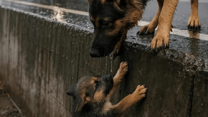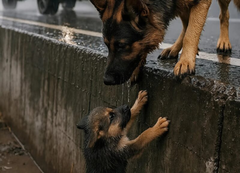 Then I saw it: down below, near a concrete wall, a small puppy was struggling in vain to climb up. Its little paw was injured, and it couldn’t make it up. When the adult dog saw me, her barking suddenly turned into a plaintive whine, as if she were begging for help.