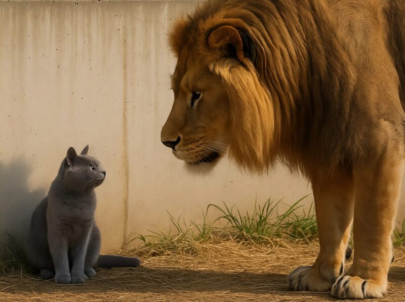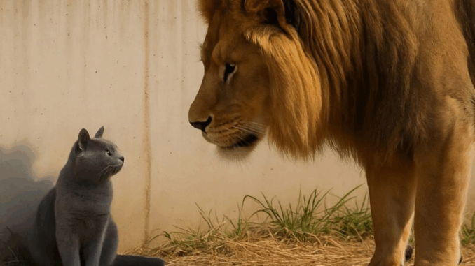 The kitten trembled with fear. Its eyes were wide open, its little body pressed against the concrete wall as if searching for protection. It knew: there was no way out behind, and in front of it stood a massive lion, ready to attack.