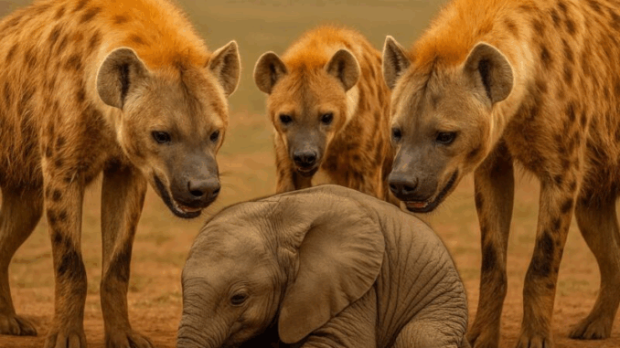 A pack of hyenas surrounded a small and helpless baby elephant, ready to attack – but you won’t believe who came to its rescue
