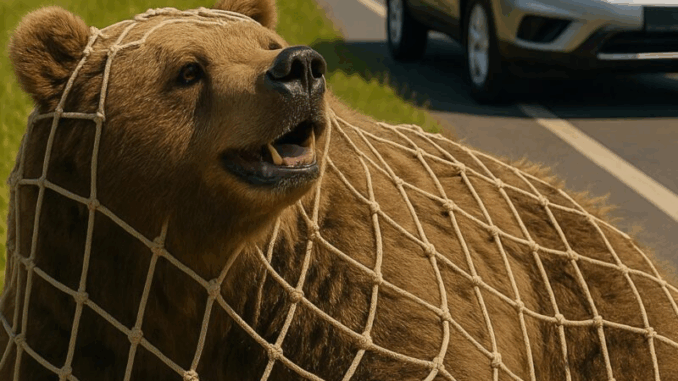 My foot pressed the gas instinctively, but on a second glance I realized: the bear wasn’t just sitting there — it was caught in a large net. The ropes pulled tightly around its shoulders and paws, its fur was matted, and the animal was breathing heavily, growling as if asking for help.