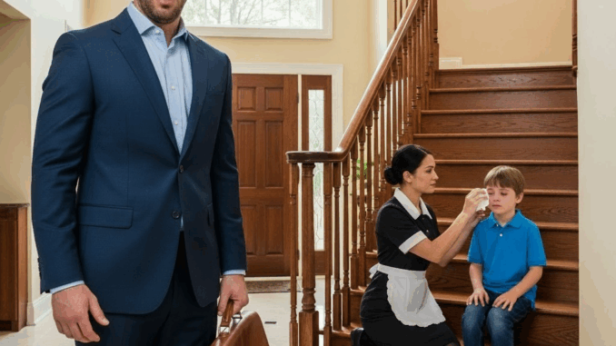 He stepped through the front door still holding his briefcase. On the staircase, his eight-year-old son, Oliver, sat stiffly, blue eyes bright with unshed tears. A faint bruise shadowed his cheek. Kneeling before him, the family’s caretaker, Grace, dabbed with a cool cloth and a tenderness that made the whole foyer feel like a chapel.