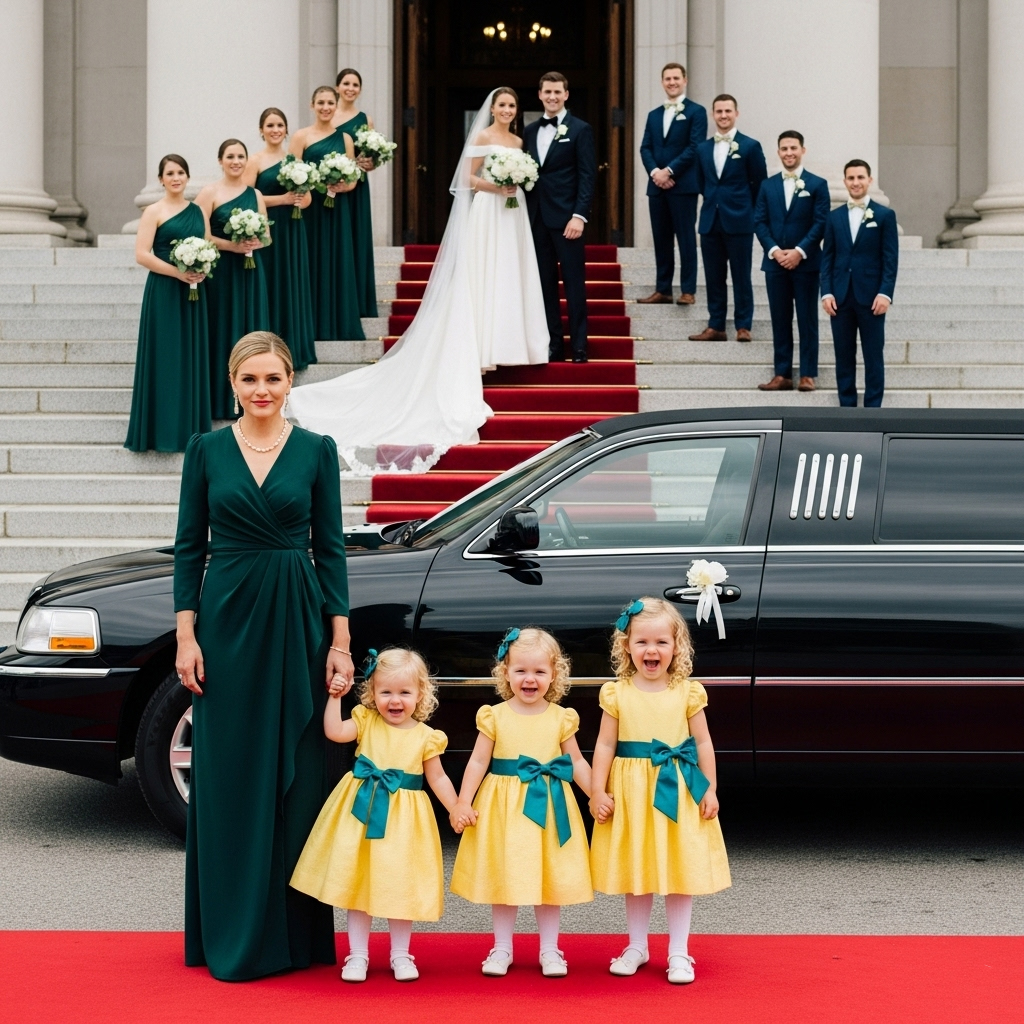 The black car stopped. The chauffeur got out and opened the door with rehearsed grace. First, three little girls in matching yellow dresses stepped out, holding hands, their curls bouncing as they walked down the red carpet. Behind them appeared Emma, ​​wearing an elegant emerald green gown. Her presence was commanding yet serene, her beauty radiant, and her strength undeniable.