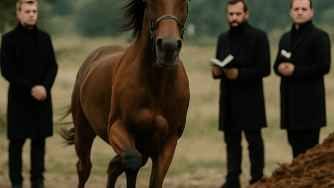 A horse appeared from the forest. Graceful, strong, with shiny chestnut fur and a white spot on its forehead. It was running straight toward the people, eyes fixed ahead. Panic broke out. Someone screamed, others scattered. They thought it was a wild or frightened animal — maybe even rabid. Someone shouted that it could trample the grave or hurt someone — the horse was charging at full speed.