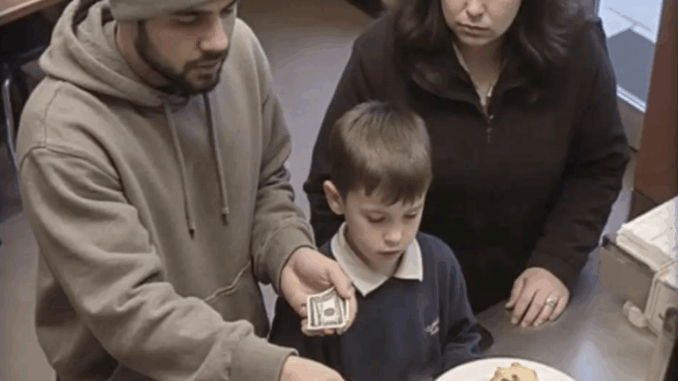 Moments later, a mother and her young son walked in. They approached the counter with hopeful eyes and five crumpled dollars in hand, asking for the breakfast special. “That’s not enough,” the cashier said flatly, waving them aside with a dismissive gesture. The young boy’s face fell, and his mother’s shoulders slumped as they turned to leave.
