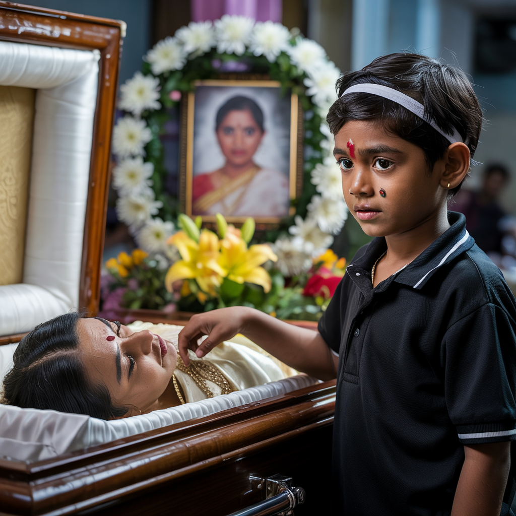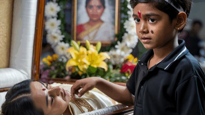 The funeral proceeded swiftly according to village customs. Incense smoke mixed with heart-wrenching sobs. Their small home was drenched in grief. Arjun sat silently, hollow-eyed, clutching a mourning cloth. Their children — from eldest to youngest — knelt beside the coffin. Among them was little Aryan, their youngest, just five years old. Too young to fully grasp death, yet his tear-filled eyes darted around as if searching for something.