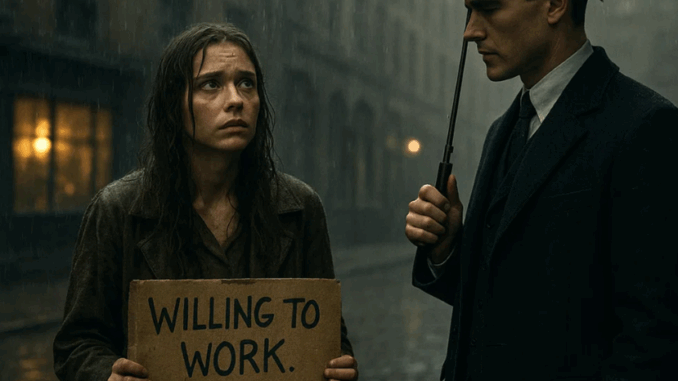 “You need work?” he asked, blinking against the rain.