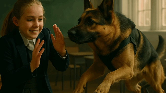 The German Shepherd lunged at a girl in the third row, barking loudly. She was a modest, quiet student named Marie—she usually sat in the back rows. Today, she stood next to her friends, holding a notebook against her chest. At first glance, she looked like an ordinary, shy girl.