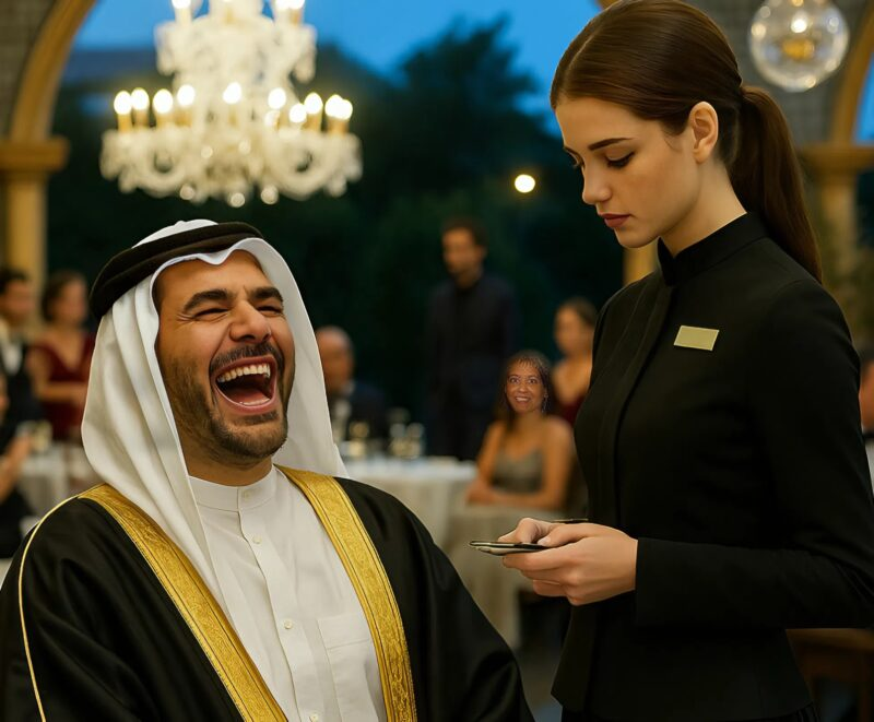 Laughter swept through the room. The waitress stood motionless, and the sheikh, convinced she understood nothing, continued to hurl insults in Arabic.