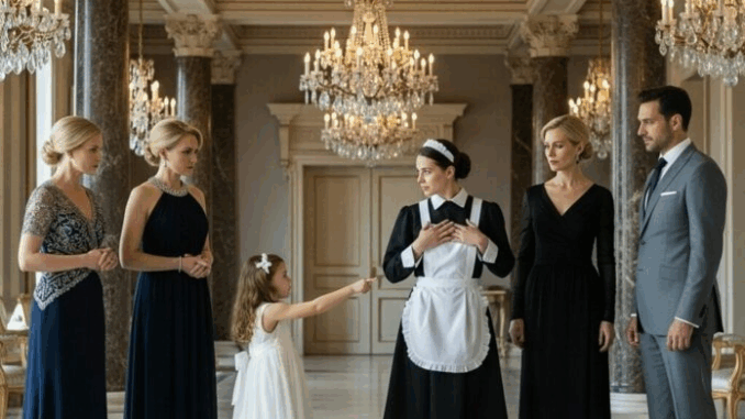 That’s when Lena Harper, a maid in her late twenties, appeared quietly with a tray of lemonade. She wasn’t meant to be there; her shift had ended, but she saw Sophie hiding behind a pillar and gently said, “Would you like some juice, sweetheart? You look thirsty.”