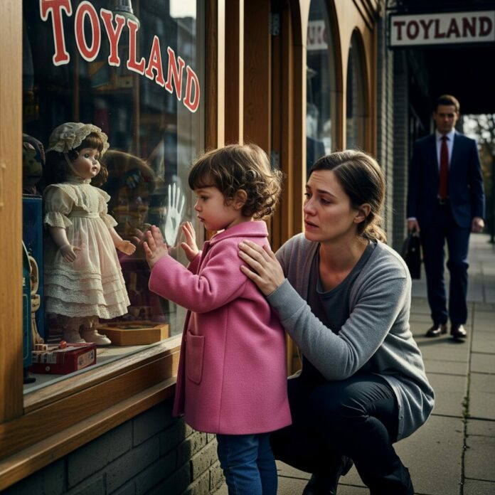 Lily peeked around Emily, hope flickering in her wide eyes. Emily hesitated, pride and necessity wrestling, but finally nodded. Inside the store, Lily wandered toward the dolls, eyes shining like a child stepping into a wonderland. She pointed at a mermaid doll with glittering scales.