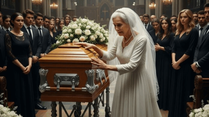 Everyone expected Kate’s father’s funeral to be quiet, dignified, and solemn. But nothing could have prepared her—or anyone in that church—for the moment the doors creaked open and a woman in her seventies walked in, wearing a flowing white wedding dress.