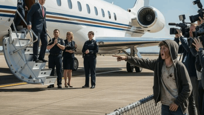 The words cut through the crisp air like a blade. Everyone froze. Heads turned toward the chain-link fence near the edge of the runway. A boy stood there, no older than twelve, his hoodie torn, his jeans dirty, sneakers ripped at the toes. His dark hair stuck out in messy strands, and his face was smudged with dust. But his eyes—wide, terrified, unblinking—were locked on Alexander.