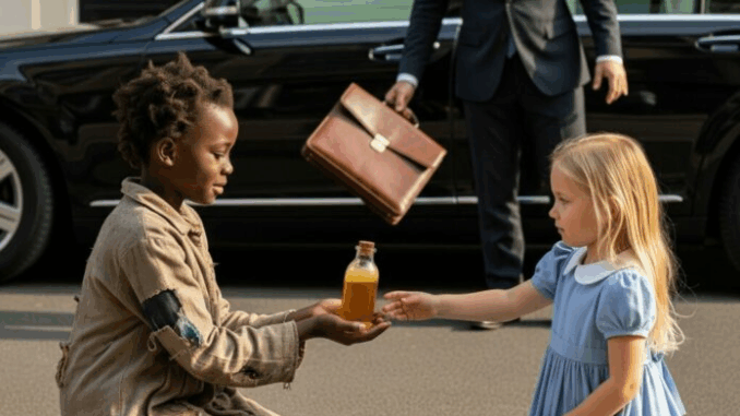 Across the plaza stood a girl her age. Her dark skin glistened with sweat, her clothes torn and dirty, her bare feet dusty from the pavement. In her hands, she clutched a small glass bottle filled with a thick golden liquid. Despite her poverty, the girl’s eyes carried determination, as if guarding a treasure.
