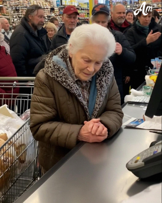 In front of us stood an elderly woman who looked to be in her late 70s. Her hair was pinned back in a soft bun, wisps of silver curling near her ears. She wore a pale green cardigan that looked well-loved, the elbows stretched from years of wear.